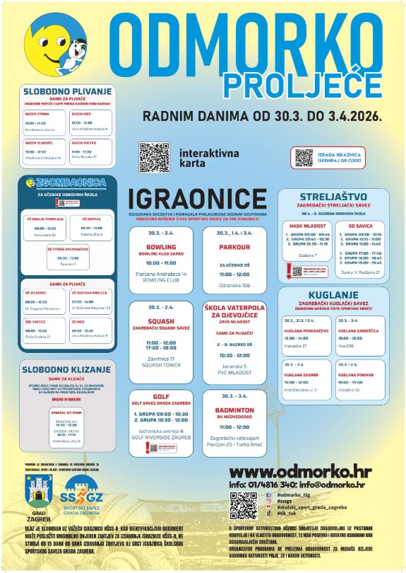 Školski sportski savez Grada Zagreba tijekom proljetnoga odmora učenika od 30. ožujka do 3. travnja 2026. godine organizira program Odmorko proljeće.