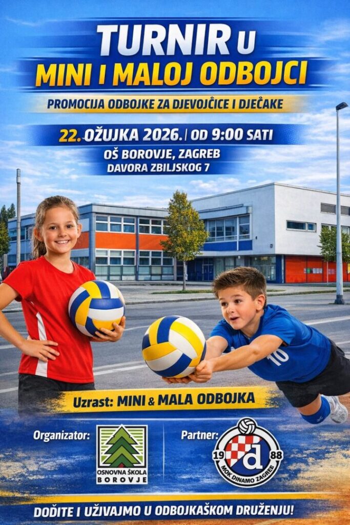Pozivamo sve učenike 3., 4., 5. i 6. razreda – bez obzira treniraš li već ili se tek želiš okušati – da nam se pridruže na turniru mini i male odbojke!