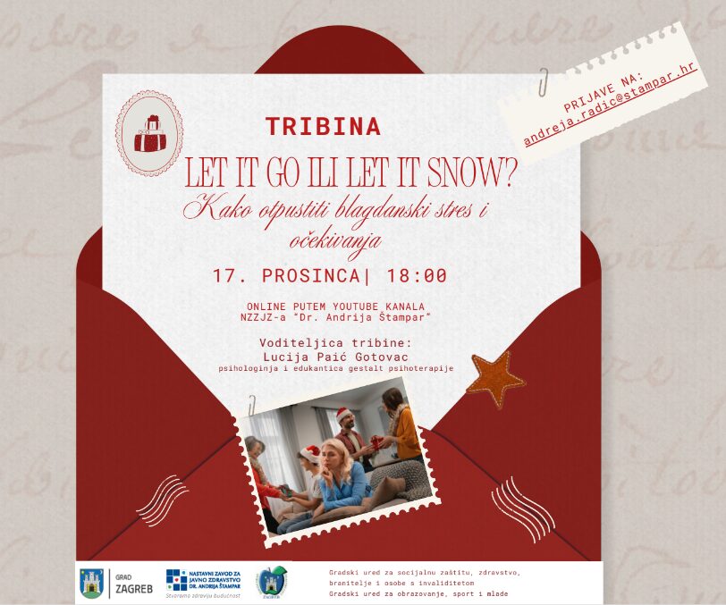 Dostavljamo poziv Službe za mentalno zdravlje i prevenciju ovisnosti NZJZ „Dr. Andrija Štampar“ na Tribinu za roditelje pod nazivom “Let it go ili Let it snow? Kako otpustiti blagdanski stres i očekivanja?, koja će se održati 17. prosinca 2025. godine s početkom u 18,00 sati putem You tube kanala.