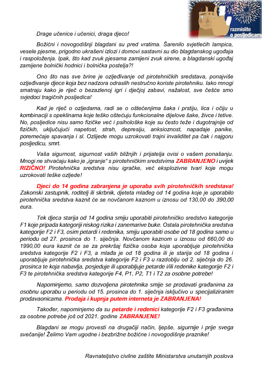 Svjesni strašnih posljedica pri nestručnoj uporabi pirotehničkih sredstava o kojima svake godine svjedoče i brojke o ozljedama, Ravnateljstvo civilne zaštite Ministarstva unutarnjih poslova upućuje apel vezan za pirotehniku svim učenicima i široj javnosti.